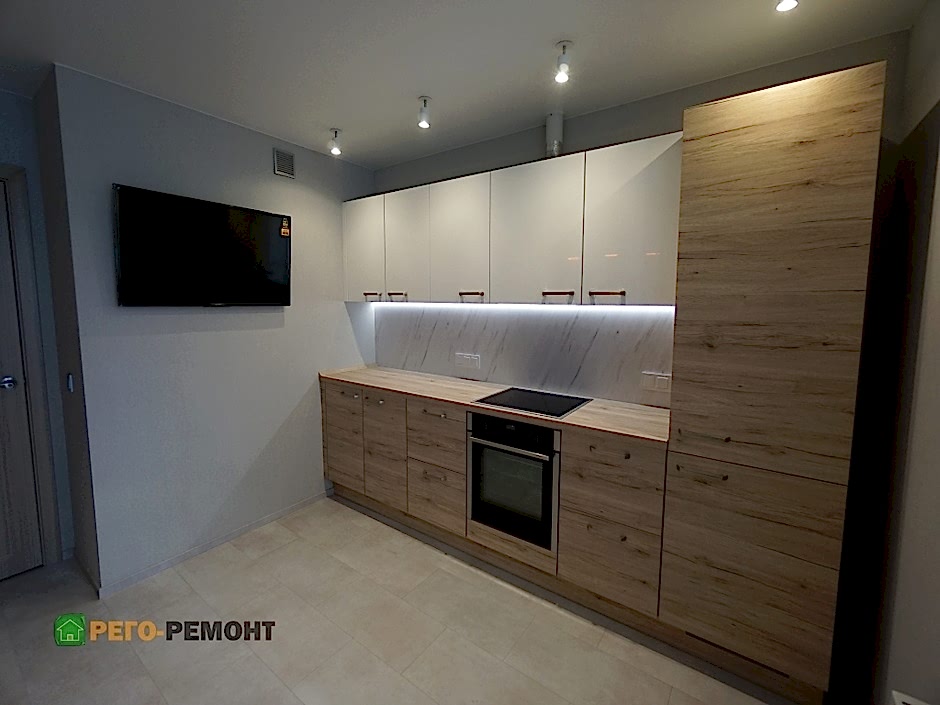 Ремонт кухни и мебель отРего-Ремонтнаул. Байтурсынова, 124. По виду не скажешь, но фасады сделаны из специальной пленки, выглядящей PinUp в один как натуральная древесина. Верхние фасады - МДФ под лако